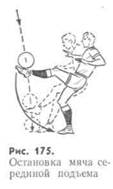 Остановка мяча серединой подъема осуществляется так: выставленная вперед нога встречает опускающийся мяч серединой подъема, после чего вместе с мячом резко опускается на землю (рис. 175). Так же выполняют остановку мяча бедром.