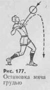 Остановка мяча грудью осуществляется в положении шага развернутой вперед грудью; руки отведены в стороны и назад. Как только мяч коснется груди, туловище резко отводят назад; находящуюся сзади ногу сгибают, плечи выдвигают вперед, а грудь как бы убирают (рис. 177). Благодаря этому движению мяч не отскакивает, а падает перед игроком. Можно остановить мяч грудью, отклони туловище назад.