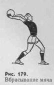Вбрасывание. Мяч, вышедший за пределы поля через боковую линию, вбрасывают руками. Игрок занимает исходное положение: одна нога впереди, другая сзади, вес тела перенесен на ногу, находящуюся сзади; мяч держит двумя руками и заносит за голову. В момент замаха обе ноги согнуты в коленях; нога, находящаяся сзади, поставлена на носок. Мяч берут таким образом, чтобы большие пальцы почти соприкасались. Бросок выполняют энергичным разгибанием стоящей сзади ноги, сгибанием туловища и движением рук (рис. 179). Вбрасывание может выполняться и из стойки ноги врозь..