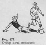 ит в том, что отнимающий игрок в падении на правый или левый бок стремится вытолкнуть мяч из-под ног ведущего (рис. 178).