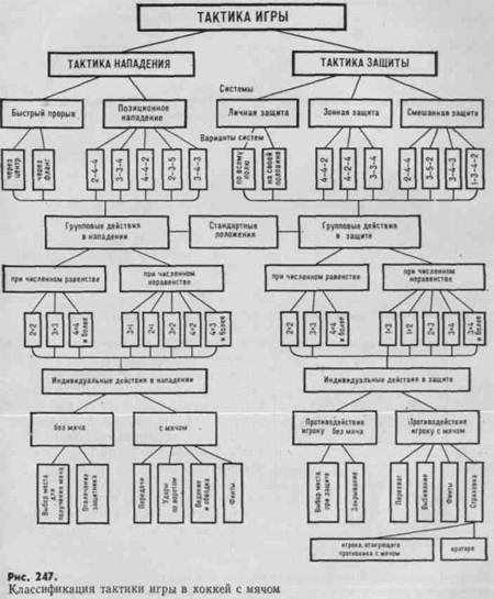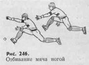 Если поймать мяч невозможно, то вратарь отбивает его коньком, ногой или рукой. Отбивание ногой выполняют преимущественно внутренней стороной конька (рис. 246).