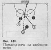 Передача на свободное место сложна тем, что игрок, учитывая скорость движения партнера и расположение соперника, должен определить направление, высоту и скорость передачи. Выполнять ее следует так, чтобы партнер, получивший мяч, мог быстро перейти к дальнейшим действиям (рис. 248).