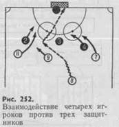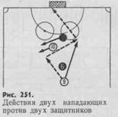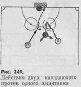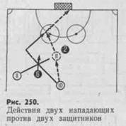 Самая простая тактическая комбинация в нападении — передача между двумя игроками. Если игроки нападающей команды имеют численное превосходство, они должны быстро продвигаться к воротам, чтобы заставить защитников вступить в борьбу за мяч (рис. 249—252).