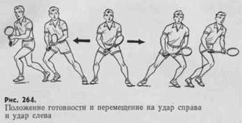 дуется поддерживать ракетку за шейку свободной рукой. В стартовом положении вес тела переносят на носки слегка согнутых в коленях ног. Из положения готовности начинают выполнять любой технический прием (рис. 264). Перемещается теннисист по площадке мелкими шагами на мягких, пружинистых ногах (рис. 264). От точности подхода к мячу и согласованности подготовительных движений во многом зависит успех удара. Здесь большую роль играет зрительный анализатор. Способность предугадать траекторию полета мяча, летящего с большой скоростью и с разным вращением, точку приземления и