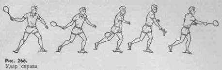 Удар справа. Подготовка к удару начинается с перемещения из положения готовности к месту встречи с мячом. В это время выполняют замах (рис. 266), разворачиваясь левым боком к сетке. Рука несколько согнута в локтевом и разогнута в лучезапястном суставе. Струнная поверхность ракетки во время замаха повернута в направлении будущего удара.