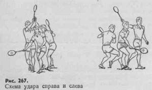 Удар слева. Закономерности выполнения удара слева и справа общие. Только в ударе слева делается несколько больший разворот туловища влево — до положения почти спиной к сетке (рис. 267). К моменту удара правую ногу выставляют вперед-влево, ноги в коленных суставах сгибают несколько больше, чем при ударе справа. Значительный поворот туловища дает возможность увеличить амплитуду движения руки с ракеткой и удлинить путь ракетки навстречу мячу. Головка ракетки из наивысшей точки в конце замаха опускается на уровень предполагаемого удара. Вперед выносят вначале плечо, затем предплечье, кисть и ракетку. Нижний кра" обода ракетки выводят несколько вперед.