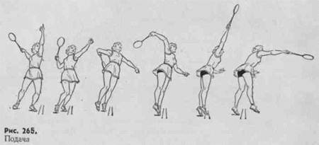 Подача — удар, с которого начинается игра,— выполняется из устойчивого исходного положения за задней линией площадки вправо или влево со средней метки. Спортсмен стоит боком к сетке, ноги расставлены на ширину плеч. Подготовительная фаза начинается с отведения правой руки и ракетки максимально назад и одновременного движения левой рукой вверх для подброса мяча (рис. 265, кадр. /). Мяч выпускается из вытянутой вверх левой руки с раскрытой кверху ладонью на высоту около метра.