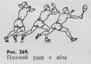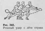 Удары с лёта. Этим ударом, как правило, завершается розыгрыш очка. Однако он можат быть и защитным — при отражении сильного обводящего мяча у сетки. Движение при ударе с лёта отличается достаточно коротким замахом (рис. 268). Точка удара вынесена вперед. Головка ракетки поднята выше, кисть закреплена. Движения всех звеньев тела очень прямолинейны, слитны, направлены в сторону удара. Успех игры с лёта зависит от умения предугадать точку удара и быстро передвигаться к ней. Широкие выпады и длинные прыжки с разноименных ног — необходимые условия результативной игры у сетки. Наиболее распространены плоский и резаный удары с лёта. Резаный удар может быть выполнен из любой по высоте точки, плоским же удобно играть преимущественно сверху (рис. 269).
