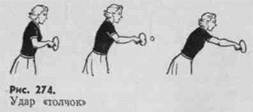 Удар без вращения («толчок») — самый простой (рис. 274). Игрок располагает ракетку параллельно сетке, как бы подставляя ее мячу; ударяясь о нее, мяч отлетает обратно. Руку при этом выпрямляют в направлении полета.
