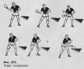Удар с нижним вращением («п о д р е з к а») выполняют движением ракеткой сверху вниз по нижней части мяча (рис. 275).