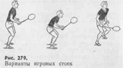 Стоика и перемещения. Принимая стойку, игрок располагается лицом к сетке, ноги слегка согнуты. Вес тела распределен равномерно на передней части стопы. Плечевой пояс слегка смещен вперед. Согнутая в локте рука держит ракетку на уровне середины бедра. Движение к волану начинают с легкого пружинистого подседания, увеличивающего силу стартового толчка. Первый шаг — направляющий, и выполняют его одновременно с наклоном тела. В дальнейшем игрок перемещается беговыми или приставными шагами, одновременно готовясь к удару. Как правило, из центра поля к сетке выходят в два шага, к задней линии — в три шага. Основные требования к перемещению — своевременность, быстрота, легкость (рис. 279).