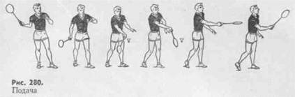 Подача. Различают короткие, плоские и высокие подачи. Подготовка к любой из них одинакова, разница лишь в финальном усилии, определяющем характер движения. Исходная позиция для выполнения подач — в центре поля. Встав левым боком к сетке, игрок переносит вес тела на ногу, находящуюся сзади. Волан легко удерживают за головку большим и указательным пальцами. Рука с ракеткой согнута в локтевом суставе и отведена назад-вверх. Выполнение подачи начинается с выпуска волана и движения ракетки. В начальной стадии ударного движения предплечье обгоняет кисть. При приближении к волану кисть все больше отводят назад. Удар выполняют ниже уровня пояса. После подачи игрок поворачивает туловище к сетке, одновременно перенося вес тела на ногу, находящуюся впереди. Ракетка по инерции движется влево-вверх (рис. 280).