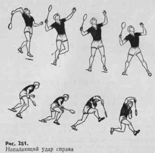 Удары справа-сверху являются основным средством ведения игры. Выполняют их выше уровня плечевого пояса. Для этого необходимо успеть на последнем шаге повернуться левым плечом к сетке на носке левой ноги и перенести вес тела на слегка согнутую ногу. Локоть руки с ракеткой должен находиться чуть ниже уровня плечевого пояса. В таком положении плечо и предплечье образуют прямой угол. Ракетка слегка опущена вперед. Левая рука вытянута вверх. Удар начинается с толчка правой ногой вперед-вверх и одновременного поворота туловища в направлении удара. В этот момент ракетка «входит в петлю», а левая нога движется назад, способствуя лучшему растяжению мышц всего тела. В дальнейшем быстрым выпрямлением, поворотом предплечья и хлестким движением кисти ракеткой наносят удар по волану. Характер удара определяется величиной финального усилия и направлением движения ракетки. Выполняя высокий удар, игрок сопровождает волан ракеткой вперед-вверх. При нападающем ударе ракетка резко движется вниз (рис. 281).