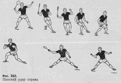 Плоские удары справа наносят по волану на уровне плечевого пояса. Замах выполняют с одновременным поворотом туловища направо. В конце замаха струнная поверхность ракетки повернута вверх. Ударное движение начинается с поворота туловища, выведения локтя вперед и последующего активного поворота и разгибания предплечья и кисти с ракеткой (рис. 282).