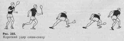 Удары слева-снизу. При замахе ракетка движется по дуге влево-вниз. Движение на удар начинается с выведения локтя в направлении предполагаемой встречи с воланом. Ракетка в этот момент находится ниже уровня предплечья и повернута струнной поверхностью вверх. Последующий характер удара определяется финальным усилием. При высоком ударе ракетка продолжает движение по инерции; при коротком — останавливается в нужном положении (рис. 285). Для эффективного выполнения ударов слева необходимо соблюдать следующие требования: