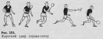 Удары справа-снизу выполняют по волану, находящемуся ниже уровня сетки. Высокий удар снизу требует значительного усилия, которое создается за счет постепенного включения в работу всех мышечных групп. Удар по волану делают снизу с последующим движением ракеткой влево-вверх. При коротких ударах рука остается согнутой в локтевом суставе (рис. 283).