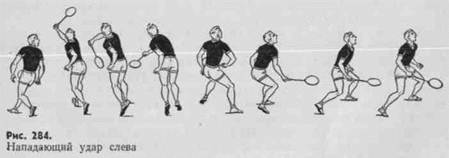 Подготовка к нападающему, высокому и короткому ударам слева однотипна, разница состоит лишь в финальном усилии, определяющем характер удара (рис. 284).