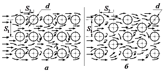 Чаще всего на практике встречается смешанный режим. В этом случае первый ряд труб обоих пучков омывается так же, как и одиночная труба. Характер обтекания остальных труб в значительной мере зависит от типа пучка. В коридорном пучке между трубами образуются застойные зоны со слабой циркуляцией жидкости, поэтому лобовая и кормовая части этих труб омываются с меньшей интенсивностью: поток в основном проходит в продольных зазорах между трубами. В шахматном пучке характер обтекания труб второго и последующего рядов качественно мало отличается от обтекания труб первого ряда.