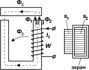 про ходит через экран и наводит в нем эдс. Возникающий при этом в экране ток создает в экранированной части полюса свой магнитный поток
