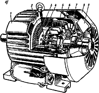 | Рис. 1. Устройство асинхронного двигателя с короткозамкнутым ротором (а, б) и схема его включения (в): 1 — корпус; 2 — сердечник статора; 3 — сердечник ротора; 4 — обмотка ротора — беличья клетка; 5 — обмотка статора; 6 — вентиляционные лопатки ротора; 7 — подшипниковый щит; 8 — кожух вентилятора; 9 — вентилятор |