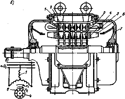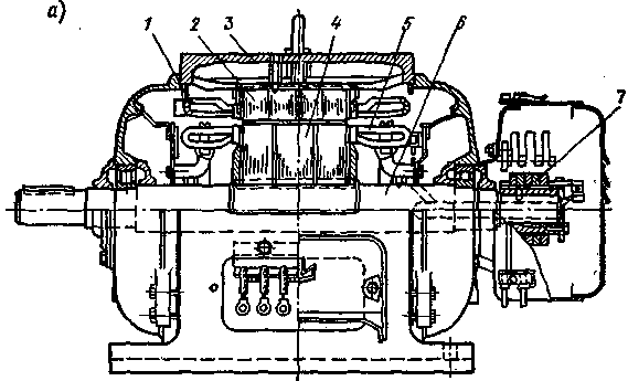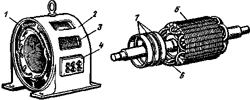 | Рис. 4. Статор и ротор асинхронного двигателя с фазным ротором: 1 - обмотка статора; 2 - корпус; 3 - сердечник статора; 4 -коробка с выводами; 5 - сердечник ротора; 6 - обмотка ротора; 7 -контактные кольца |