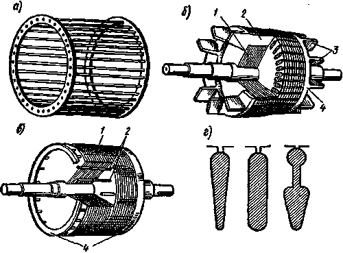 Для этой цели особенно пригоден алюминий, так как он обладает малой плотностью, легкоплавкостью и достаточно высокой электропроводностью. В машинах большой мощности пазы короткозамкнутого ротора выполняют полузакрытыми, в машинах малой мощности - закрытыми. Обе формы паза позволяют хорошо укрепить проводники обмотки ротора, хотя и несколько увеличивают потоки рассеяния и индуктивное сопротивление роторной обмотки. В двигателях большой мощности беличью клетку выполняют из медных стержней, концы которых вваривают в короткозамыкающие кольца (рис. 2, в). Различные формы пазов ротора показаны на рис. 2, г.