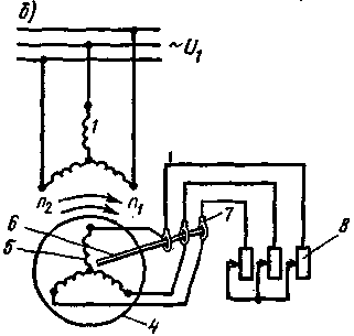 | Рис. 3. Устройство асинхронного двигателя с фазным ротором и схема его включения: 1 - обмотка статора; 2 - сердечник статора; 3 - корпус; 4 - сердечник ротора; 5 - обмотка ротора; б - вал; 7 - кольца; 8 - пусковой реостат |
