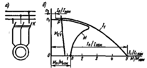 Двигатели обычно пускают с помощью электромагнитного выключателя К - магнитного пускателя (рис. 4.27, а) и разгоняют автоматически по естественной механической характеристике М (рис. 4.27,6) от точки П, соответствующей начальному моменту пуска, до точки Р, соответствующей условию М = М ст. Ускорение при разгоне определяется разностью абсцисс кривых М и М ст и моментом инерции ротора двигателя и механизма, который приводится во вращение. Если в начальный момент пуска М п< М ст, двигатель разогнаться не сможет.
