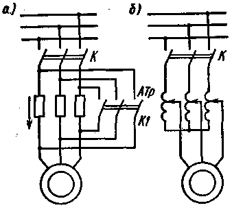 | Рис. 4.28. Схемы включения асинхронного двигателя при пуске с понижением напряжения |