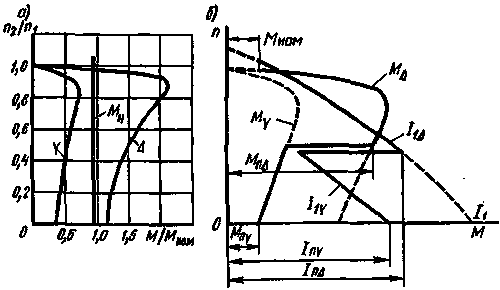 | Рис. 4.29. Механические характеристики при включении обмотки статора двигателя по схемам Y и Δ (а) и графики изменения М и I 1 при пуске двигателя путем переключения обмотки статора со Y на Δ (б) |