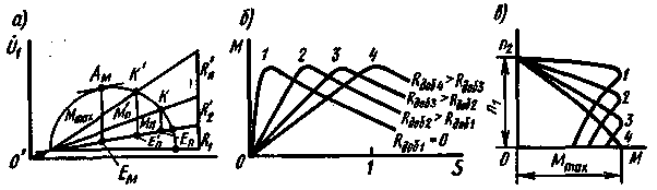 Пуск с помощью реостата в цепи ротора. Этот способ применяют для пуска двигателей с фазным ротором. Если в цепь ротора включить пусковой реостат R п, то активное сопротивление цепи ротора увеличится, вследствие чего точка К на круговой диаграмме (рис. 4.30, а) сместится ближе к точке О (точка К'). При этом максимальный момент (отрезок А м Е м) не изменяется, а пусковой момент возрастает от значения М п до М' п, так как увеличивается отрезок КЕ п, пропорциональный этому моменту. Одновременно повышается критическое скольжение, а поэтому зависимость М =f (s) сдвигается в область больших скольжений, а зависимость п 2= f (М) — в область меньших частот вращения (рис. 4.30, 6 и в, кривые 1—4).
