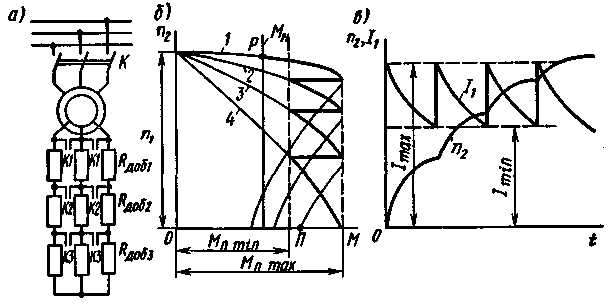 Пусковой реостат имеет обычно три — шесть ступеней (рис. 4.31, а), что позволяет в процессе пуска постепенно уменьшать пусковое сопротивление, поддерживая высокое значение пуско-вого момента двигателя. Сначала двигатель пускается по характеристике 4 (рис. 4.31,6), соответствующей сопротивлению