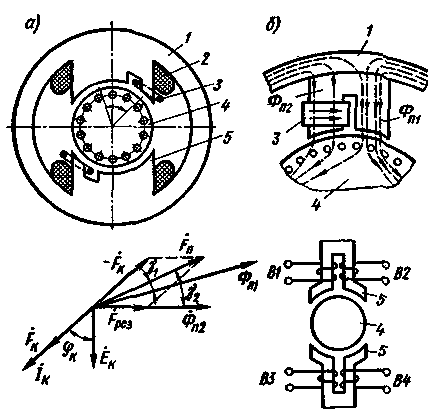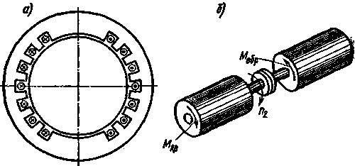 | Рис. 4.60. Поперечный разрез статора однофазного асинхронного двигателя (о) и направление вращающих моментов, действующих на его ротор (б) |