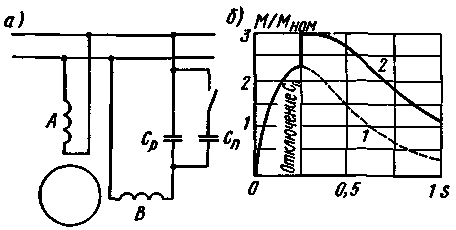 | Рис. 4.63. Схема конденсаторного асинхронного двигателя (a) и его механическая характеристика (б) |