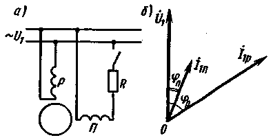 | Рис. 4.64. Схема однофазного асинхронного двигателя с пусковым сопротивлением (а) и его векторная диаграмма (б) | |
