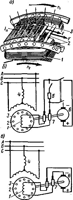 Рис. 6.48. Устройство пусковой обмотки синхронного двигателя (о) и схемы его асинхронного пуска (б и в): 1 - обмотка возбуждения; 2 - пусковая обмотка; 3 - ротор; 4 - обмотка якоря; 5 - гасящее сопротивление; 6 - якорь возбудителя; 7 - кольца и щетки