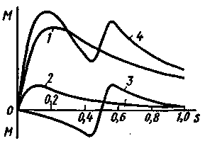 В обмотке статора обратным полем индуцируется ЭДС с частотой f1(1 — 2s), для которой обмотка статора является короткозамкнутой. При этом по обмотке статора проходит соответствующий ток. Взаимодействуя с обратным полем ротора, этот ток создает электромагнитный момент М о6р. Так как направление момента зависит от направления вращения поля n р.обр относительно статора, то из формулы (6.47) следует, что он является знакопеременным и изменение его направления происходит при s = 0,5 (рис. 6.49, кривая 3).