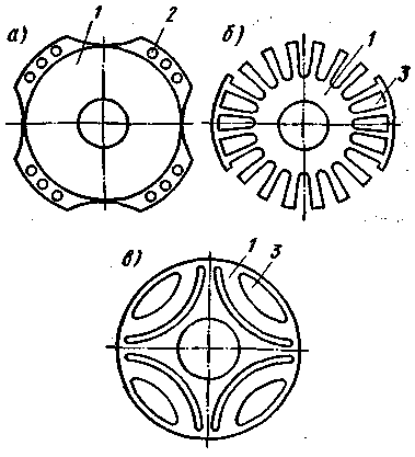 | Рис. 7.6. Роторы реактивных двигателей: 1 — пакет ротора; 2 — обмотка типа «беличья клетка»; 3 — вырезы, залитые алюминиевым сплавом |