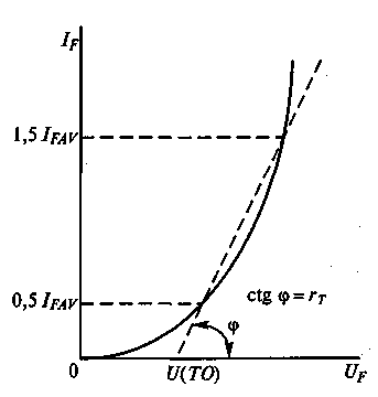 Дифференциальное прямое сопротивление rT определяют по углу наклона линии прямолинейной аппроксимации прямой ВАХ диода к оси напряжения (рис. 6.2).
