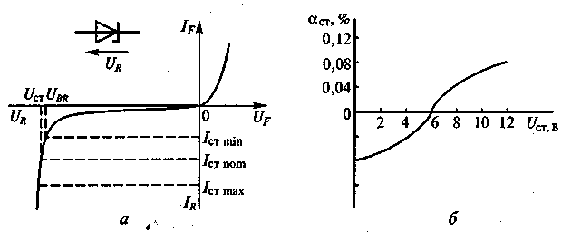 Рис. 7.8. Вольт-амперная характеристика стабилитрона (а) и зависи-