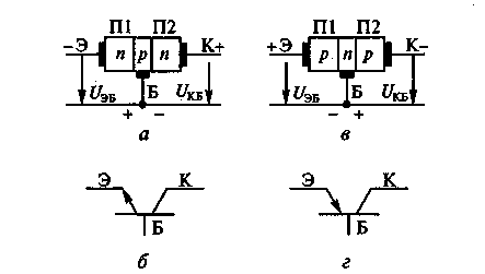 Рис. 6.4. Структура и графическое обозначение транзисторов: а и б — п—р— л-типа; в и г — р—п—р-тииа