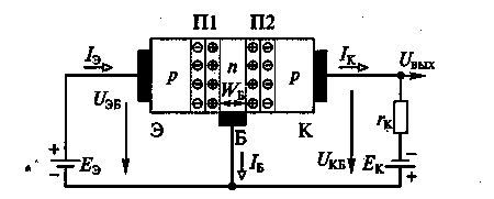 Внутреннюю область монокристалла транзистора, разделяющую p-n -переходы П1 и П2, называют базой (Б). Внешний слой монокристалла, инжектирующий носители в базу, называют эмиттером (Э), а примыкающий к нему p-n -переход П1 — эмиттерным. Второй внешний слой, выхватывающий носители из базы, называют коллектором (К), а примыкающий к нему переход П2 — коллекторным. База является электродом, управляющим величиной тока через транзистор, поскольку, изменяя напряжение между эмиттером и базой, можно управлять величиной инжектируемого (эмиттерного), а значит, и коллекторного тока.