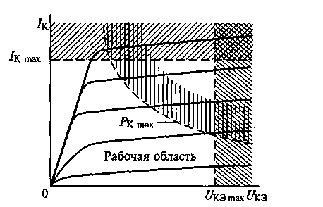 Область, заключенную внутри ограничивающих линий, называют рабочей областью характеристик транзистора.