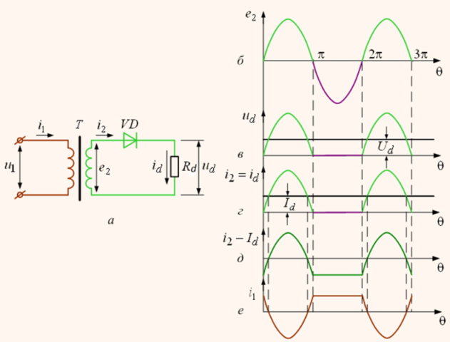 Рис.4.2. Однофазный однополупериодный выпрямитель.