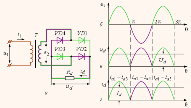 Во время положительного полупериода ток проходит от плюса вторичной обмотки трансформатора через диод VD1, сопротивление нагрузки Rd, диод VD3 на минус вторичной обмотки. В это время ко второй паре диодов VD2, VD4 приложено обратное напряжение. Они закрыты. Во время отрицательного полупериода ток протекает через диод VD2, нагрузку Rd, диод VD4. В случае чисто активной нагрузки, пренебрежением индуктивности обмотки трансформатора и идеальных диодах эта схема имеет следующие основные соотношения: