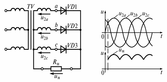 В этой схеме первичные обмотки трехфазного трансформатора могут соединятся звездой или треугольником, а вторичные - звездой, причем в каждую вторичную обмотку включено по диоду. В этом случае в каждый момент выпрямленный ток проходит только через тот диод, анод которого соединен с зажимом обмотки, имеющим наибольший положительный потенциал по отношению к нейтральной точке трансформатора. Поэтому выпрямленное напряжение будет изменяться по кривой, являющейся огибающей положительных полуволн фазных напряжений вторичных обмоток трансформатора (рис.4.8). Переключение диодов происходит в моменты, соответствующие пересечению положительных полусинусоид напряжения. В нагрузке Rн токи, походящие через три диода, суммируются.