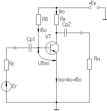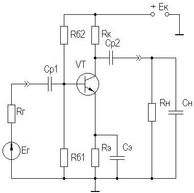 Среди многочисленных вариантов усилительных каскадов на БТ самое широкое применение находит каскад с ОЭ, имеющий максимальный коэффициент передачи по мощности KP, вариант схемы которого приведен на рисунке 2.9.