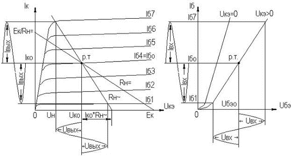 Графически проиллюстрировать работу каскада с ОЭ можно, используя входные и выходные статические характеристики БТ, путем построения его динамических характеристик (ДХ) [5,6]. Вследствие слабой зависимости входной проводимости транзистора g от величины нагрузки, входные статические и динамические характеристики практически совпадают. Выходные ДХ — это прямые линии, которые в координатах Iк, Uкэ соответствуют уравнениям, выражающим зависимости между постоянными и переменными значениями токов и напряжений на нагрузках каскада по постоянному и переменному току.