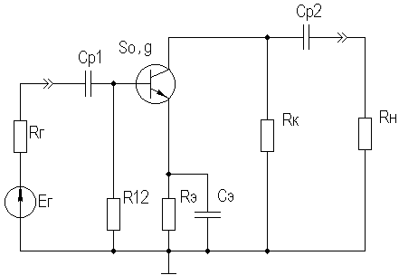 Как видно, эта схема не содержит реактивных элементов, т.к. в области СЧ влиянием на АЧХ разделительных (Cp1, Cp2) и блокировочных (Cэ) емкостей уже можно пренебречь, а влияние инерционности БТ и Cн еще незначительно.
