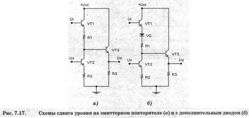 Одна из возможных схем, иллюстрирующая принцип сдвиг уровня с использованием эмиттерного повторителя, показана на рис. 7.17, а. Транзистор VT1, на базу которого подается входной сигнал Ui, выполняет роль эмиттерного повторителя. Транзистор VT2 включен генератором тока, на его базу подается напряжение Us от специальной цепи смещения. Уровень выходного напряжения определяется напряжением Е и падением напряжения на резисторе R1